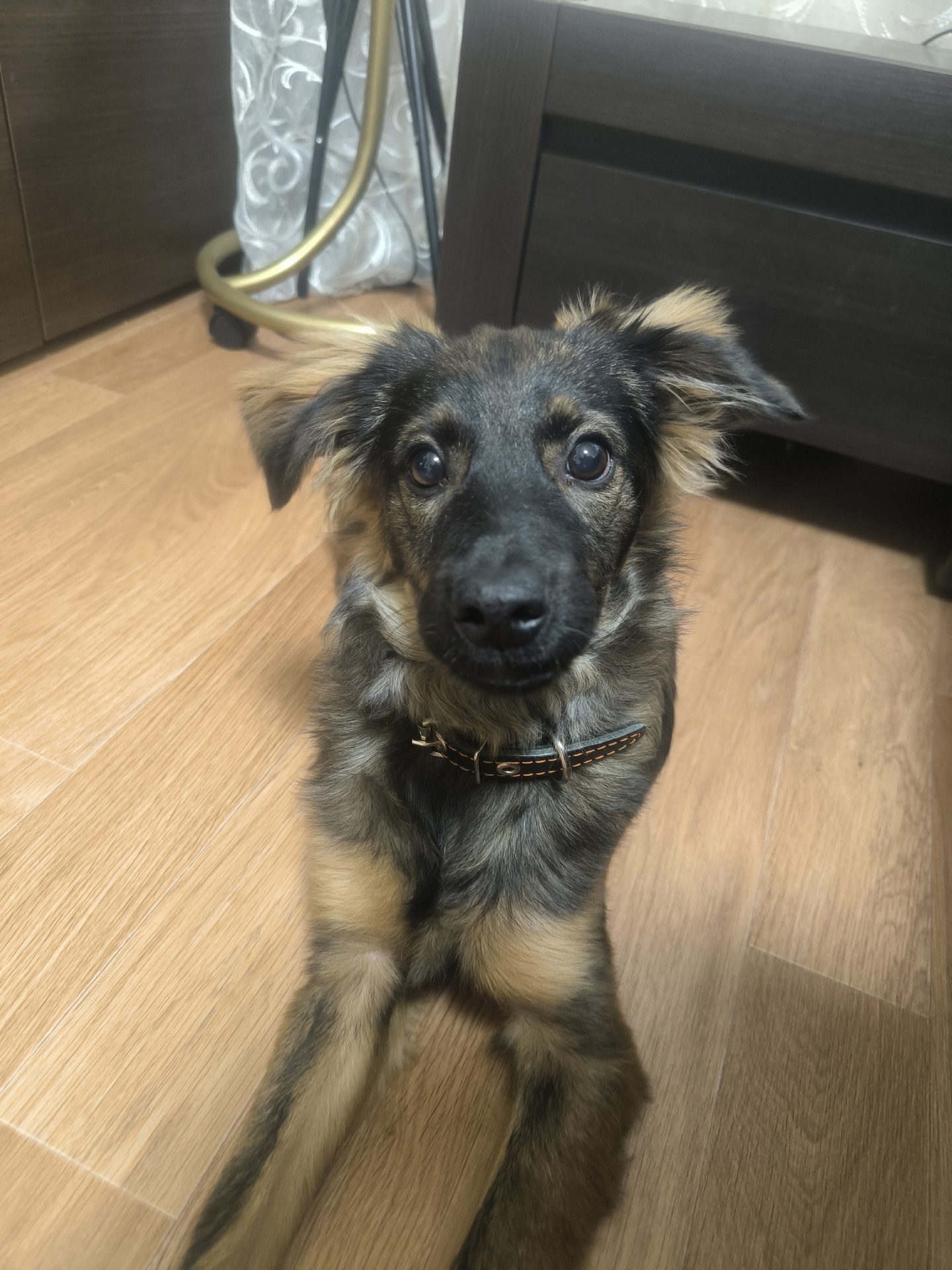 Очень общительный и игривый, довольно умный, немного знает команды (сидеть, дай лапу).
