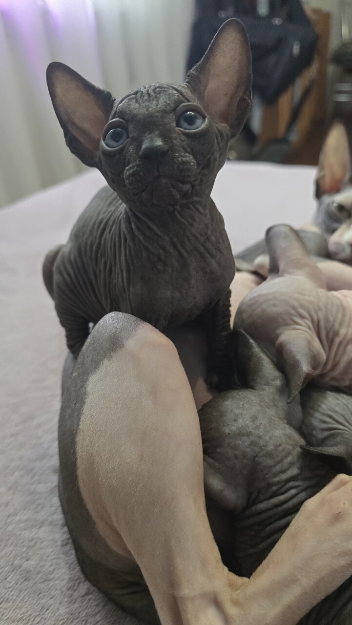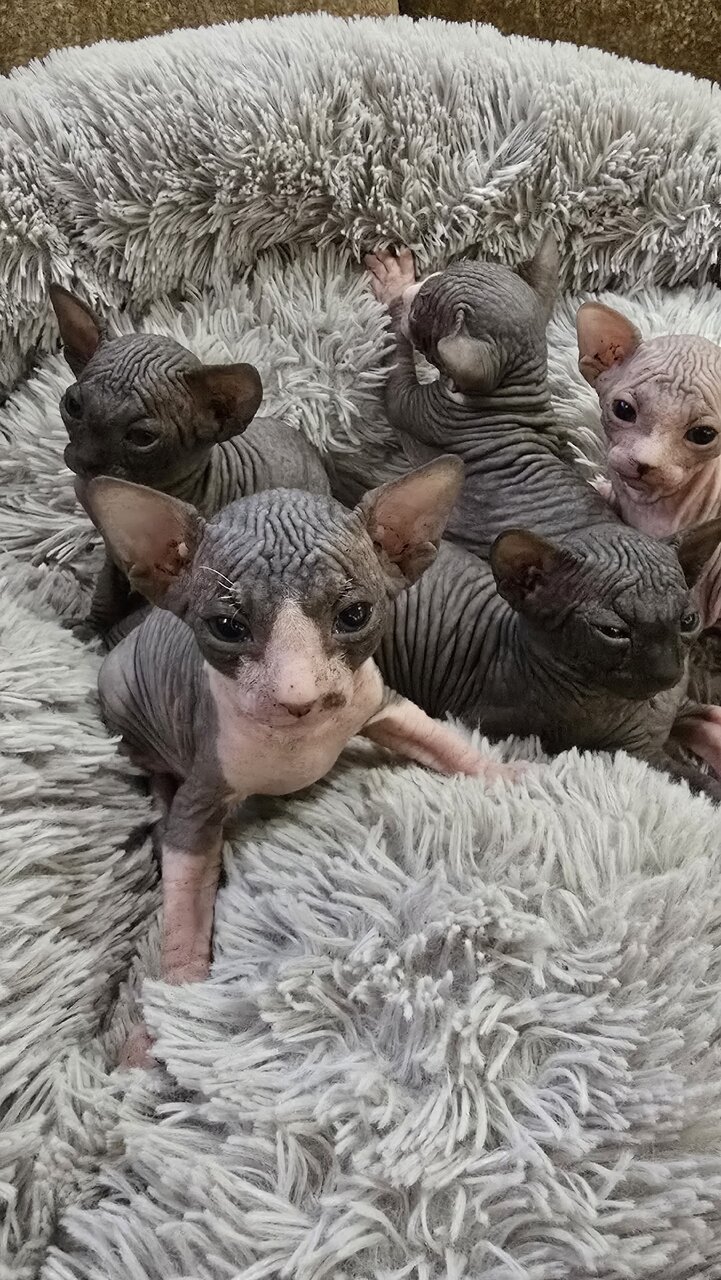 Готовы к продажи, чудесные котята канадского сфинкса!!)) 2 девочки и 3 мальчика Родились 22.01.26.г. Кушают корм, лоток знают на отлично)