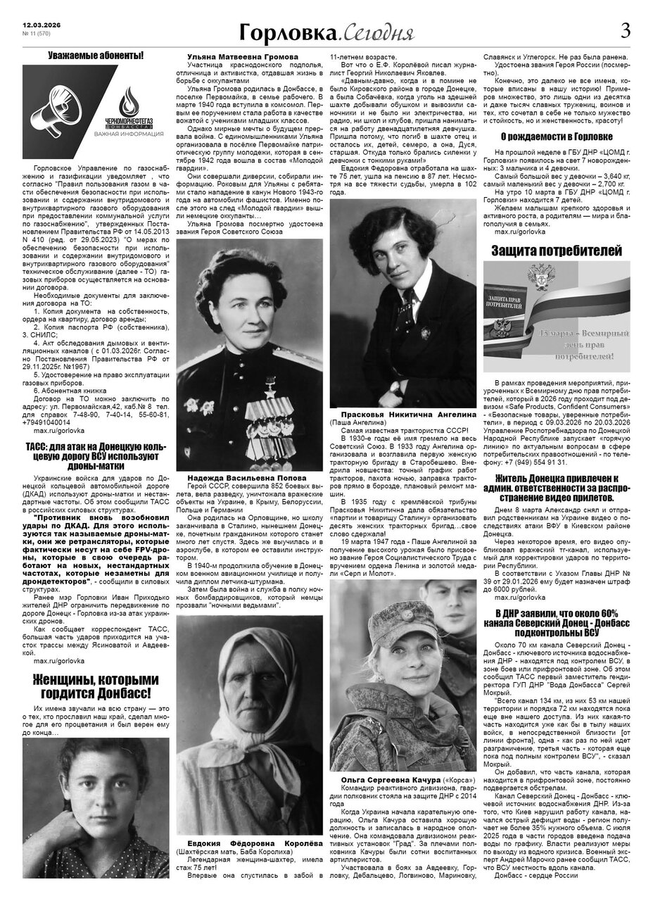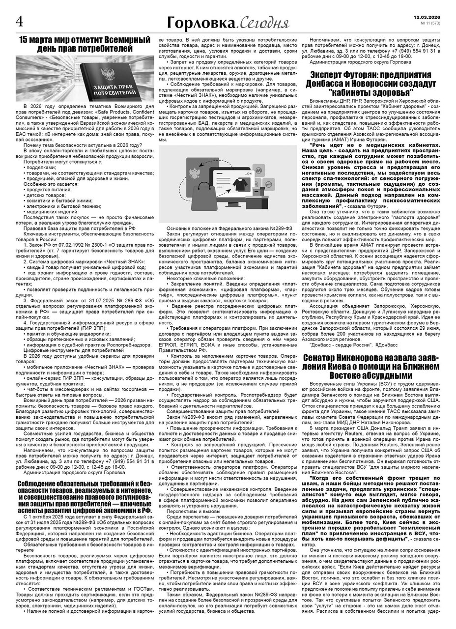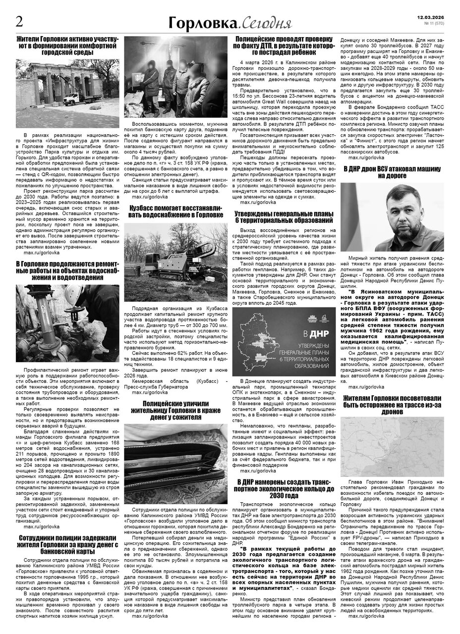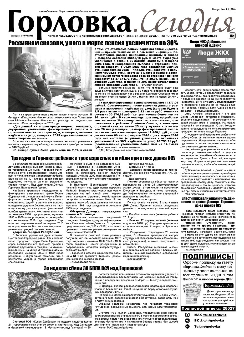 🗞 12 марта 2026 года, вышел новый выпуск общественно-информационной газеты «Горловка.Сегодня» 🇷🇺 №11 (570). 24 полосы, тираж 1900 экз., газета выходит каждый четверг. 📰 t.me/gorlovka